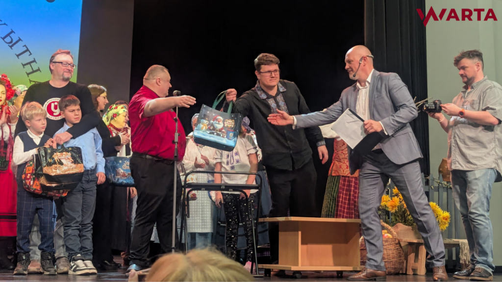 Старшыня Таварыства Беларускай Культуры ў Летуве Аляксандар Адамковіч уручае падарункі ўдзельнікам фэстывалю.