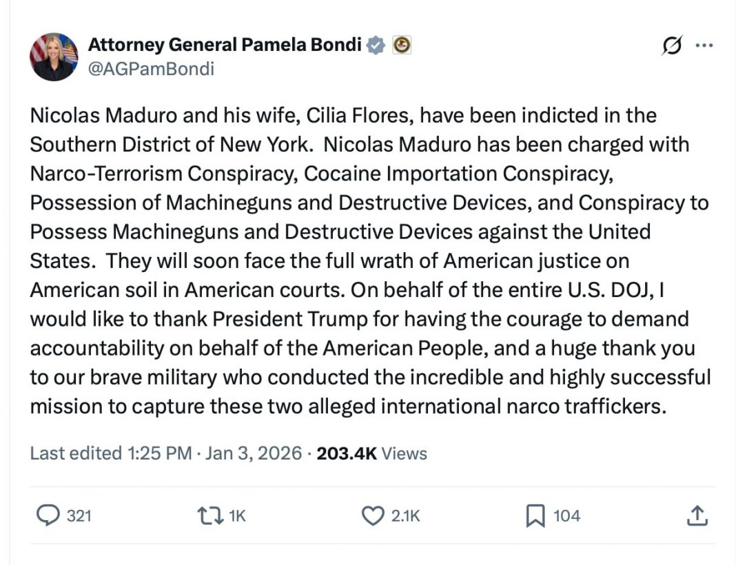 Нікаласу Мадура і яго жонцы Сіліі Флорэс прад’яўлены абвінавачваньні ў Паўднёвай акрузе Нью-Ёрка.