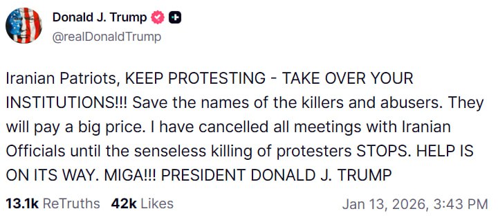 13 студзеня Дональд Трамп напісаў у сваім акаўнце сацсетцы Truth: